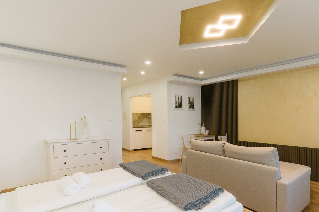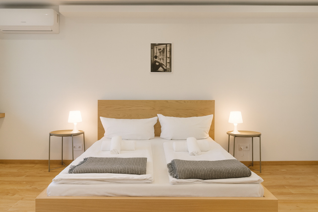 (1,60 × 2,00 m) und ein bequemes Schlafsofa (1,40 × 2,00 m), sodass bis zu vier Personen entspannt Platz finden.