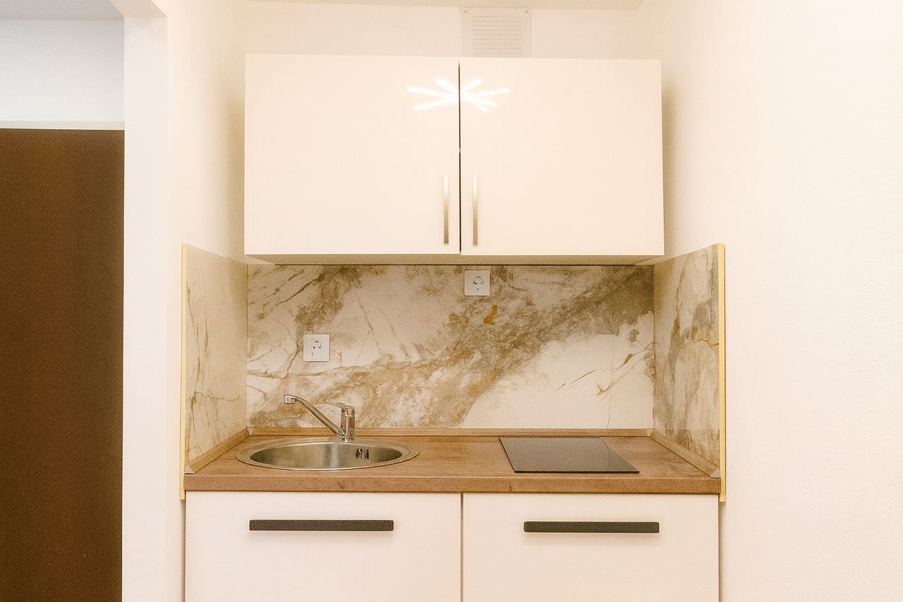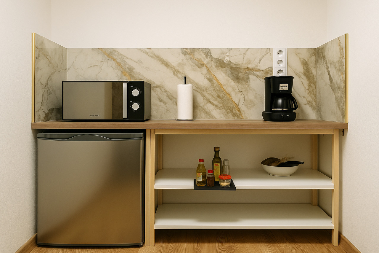 Inklusive Senseo-Kaffeemaschine, Wasserkocher, Toaster und allem, was du zum Kochen brauchst.